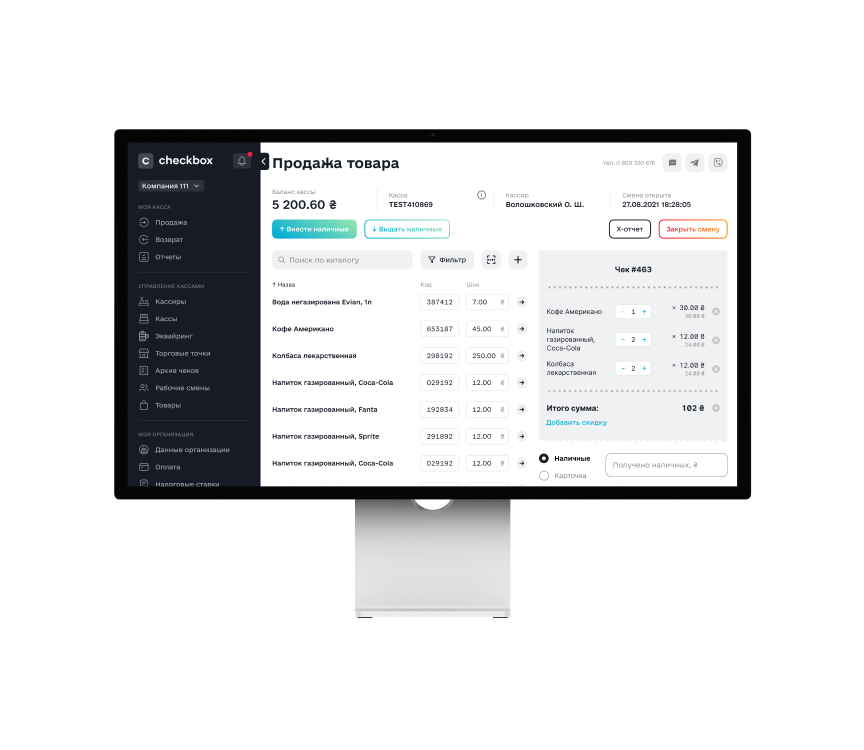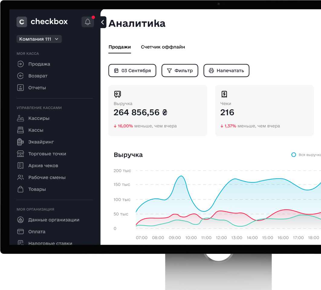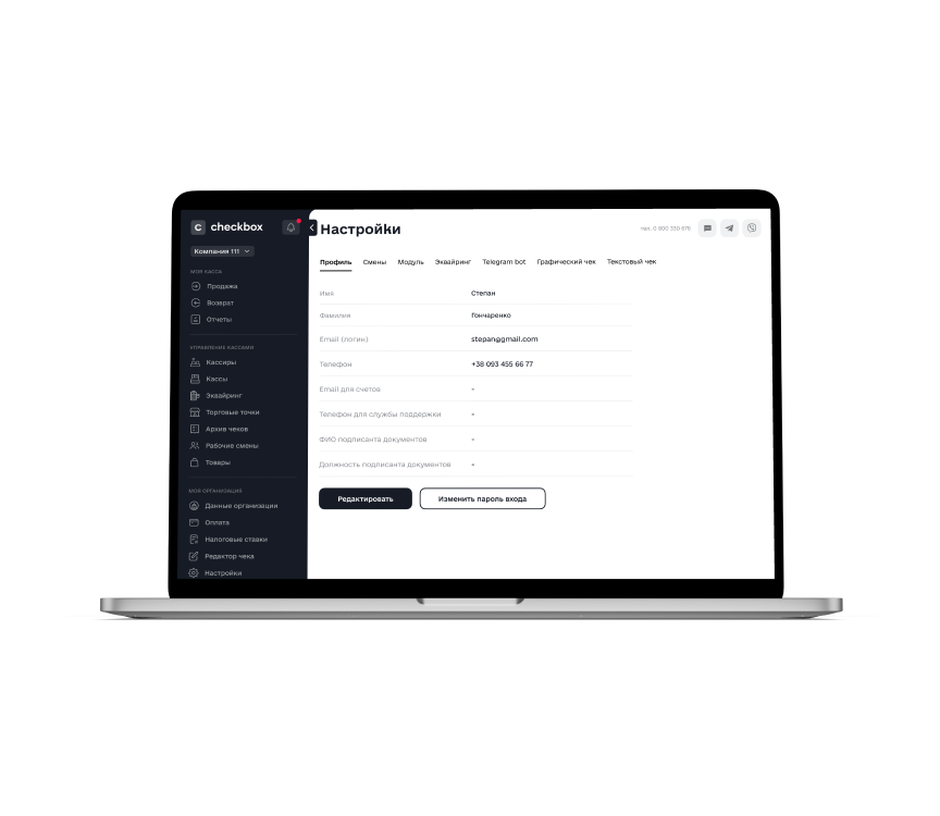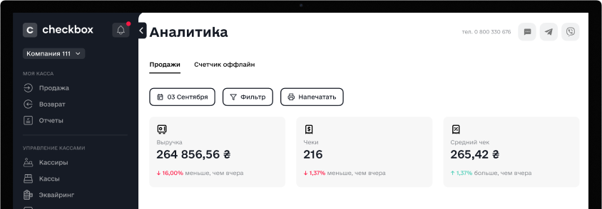 Формирование и выгрузка отчетов по продажам, итоговых отчетов за день, архив чеков – все это доступно в кабинете Checkbox